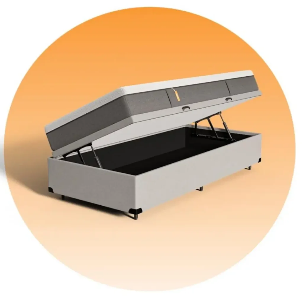 Detalhes práticos que evitam que o colchão escorregue e facilitam a abertura do baú.