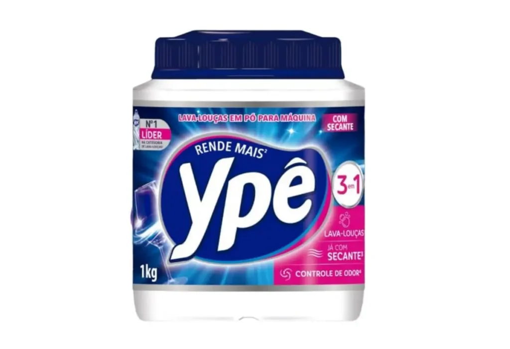 Opções como detergente em pó com enzimas, secantes e abrilhantadores como os das marcas Ypê ou Finish são ideais para garantir uma limpeza eficiente, evitar manchas e prolongar a vida útil do equipamento.