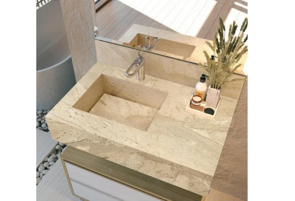 Nesse modelo, a pia é moldada diretamente no tampo do gabinete, formando uma peça única. O resultado é um visual sofisticado e integrado, com acabamento uniforme e fácil de limpar. A cuba esculpida é ideal para quem busca elegância e um toque contemporâneo, além de oferecer mais praticidade no dia a dia com menos emendas e frestas.