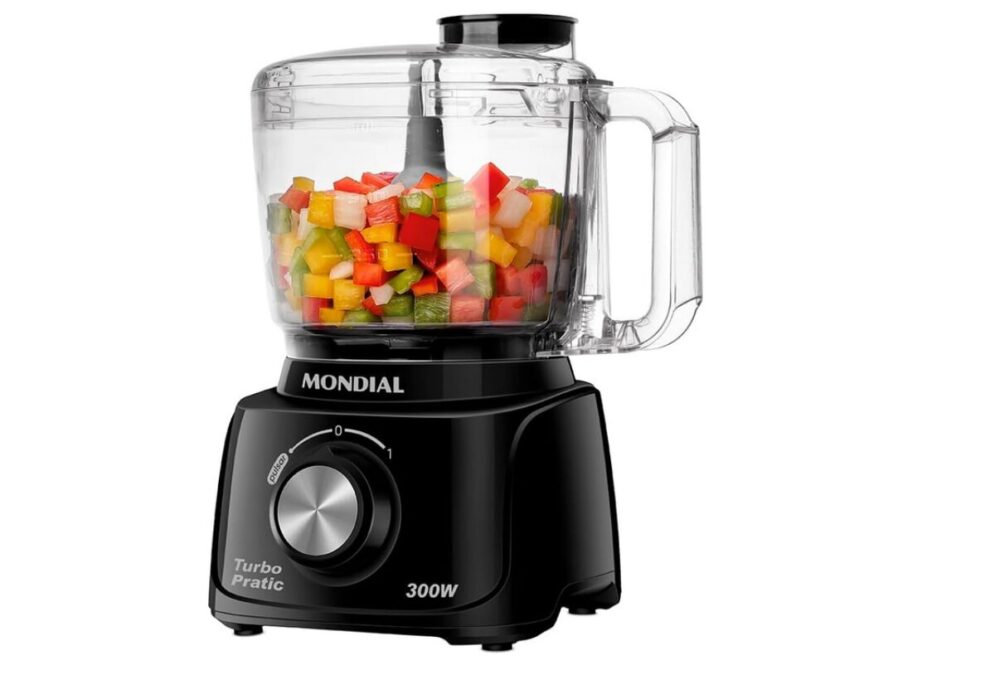 O Mini Processador Turbo Pratic da Mondial é um dos mais populares do mercado e campeão de vendas. Com potência de 300W, ele oferece ótimo desempenho para cortar, triturar e picar alimentos do dia a dia. Seu design é compacto, fácil de guardar e perfeito para quem busca praticidade.