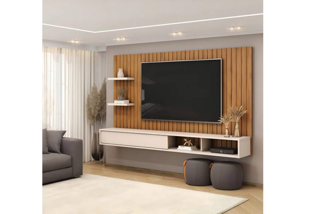 Se o objetivo é criar um ambiente leve e harmonioso, escolha tons neutros como bege, cinza claro ou carvalho. Já quem quer ousar pode apostar em ripados escuros — como nogueira ou preto — para gerar contraste e sofisticação. O ideal é que o painel complemente os móveis, sem competir com eles.