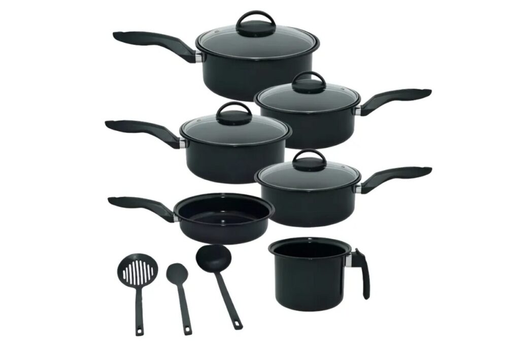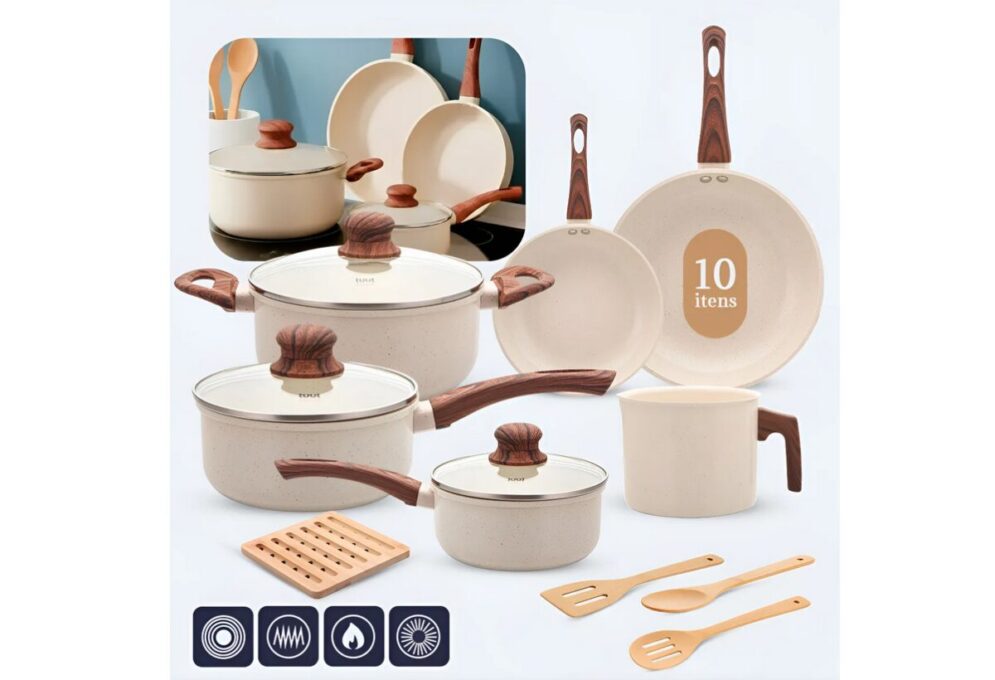 Se você busca um conjunto grande, este kit de 10 peças é uma das opções com melhor custo-benefício. Ele acompanha utensílios (espátula, concha e escumadeira), além de panelas de diferentes tamanhos.