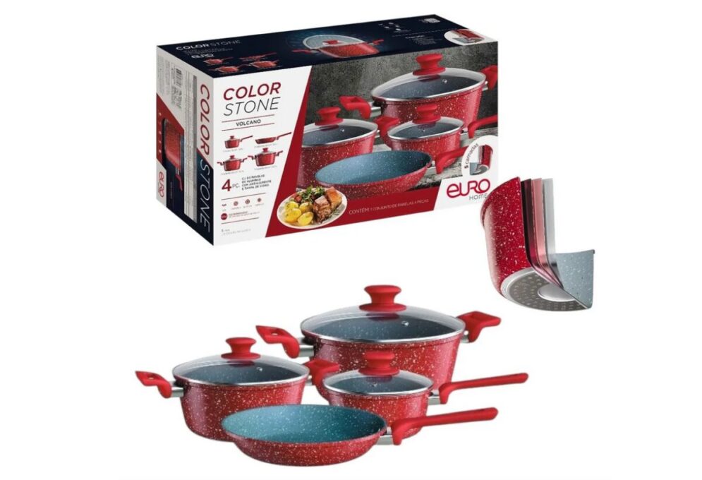 Esse é um dos kits mais robustos da categoria, com 5 camadas de materiais que combinam antiaderência, resistência ao desgaste, distribuição térmica eficiente e, claro, base magnética para indução.
