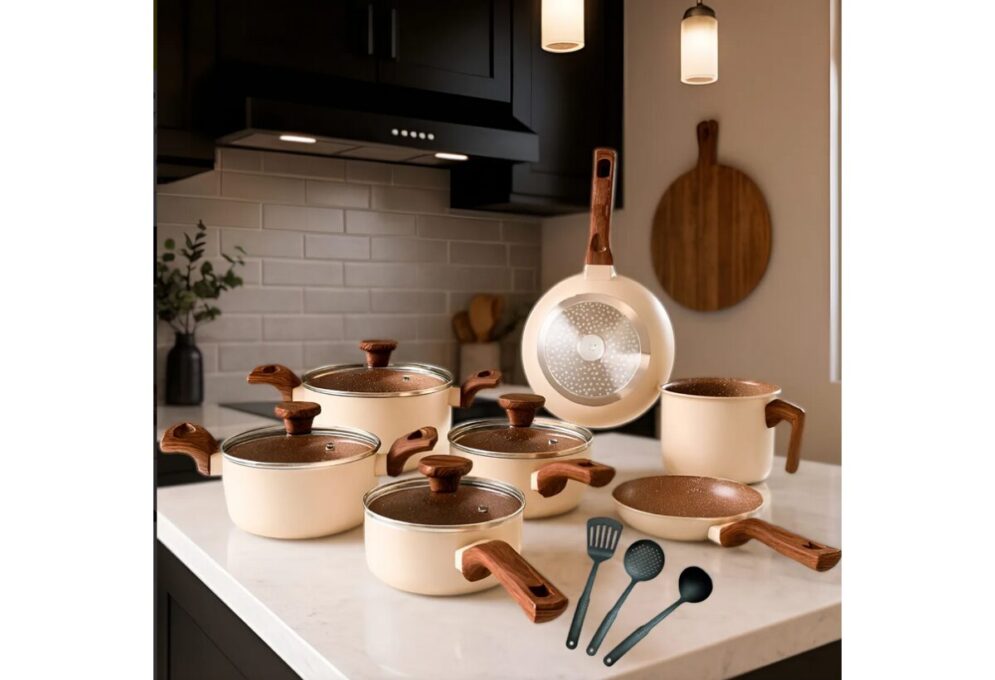 O Jogo de Panelas Tuut Ecoglide se destaca pela combinação de antiaderência em cerâmica e compatibilidade com fogão de indução, oferecendo cozimento rápido, uniforme e com menos óleo. O kit ainda traz acessórios em bambu que não riscam o revestimento, além de design moderno na cor PFOA FREE Vanila, ideal para quem busca praticidade com visual clean na cozinha.